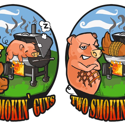 graphic design of a chicken smoking a pig (front) and then a pig covered in grill marks smoking a chicken (back).