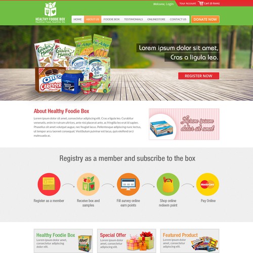 The website contains packaged healthy food samples (e.g. protein bars, tea bags) at customer's choice. The box will b...